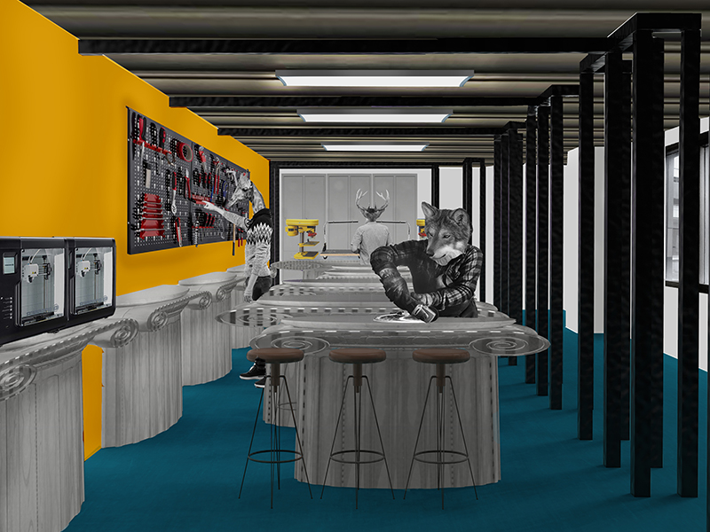 Located on the third floor of the Famar building, in the industrial district of Baranzate (MI), “The Jumble” provides for the creation of smart-working stations and fab-labs in places that until 2011 hosted a pharmaceutical company. This idea is inspired by reading the “avanzi” concept from a specific perspective, in this case identified in the (Un)Heimlich metaphor (the Freudian uncanny). The main focus is to mantain unaltered the original spaces. The proximity to the Expo area (future MIND) determined the choice to mantain the work function, although a necessity to adopt a smart-working approach has been detected, in order to make the place more integrated with the MIND future context. The uncanny elements are many. First of all, the work-fun alternation: the same spaces that during the week host workers and makers, in the weekend become escape-room or indoor paintball places. Other interventions leverage on the contrast between familiarity and extraneousness, such as in the spaces where is created a domestic atmosphere, with the addition of elements that increase the user’s comfort.